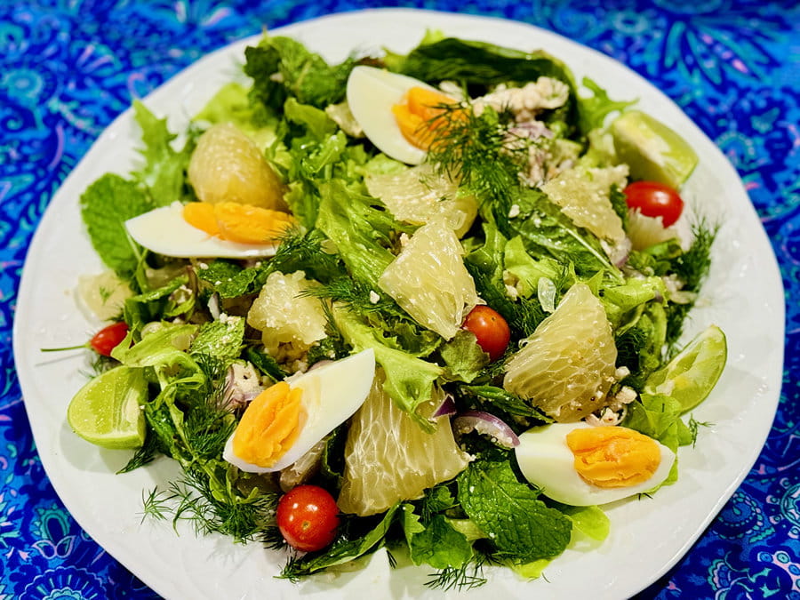 ソムオーはサラダと相性のよい果物で、我が家では、ソムオーにルッコラとバナナを合わせ、マナオを絞っただけのサラダが定番です。今回は、タイ料理のヤム・ソムオーにヒントを得て、洋風に楽しみたいときのレシピとして考えました。あえてカオクアを使っていますが、なくても問題ありません。もっとタイ寄りにするなら、塩ではなくナンプラーを使い、オリーブオイルを合わせてもよいですし、粉唐辛子を加えるのもおすすめです。使うものは、ぜひ自由な発想でお楽しみください。