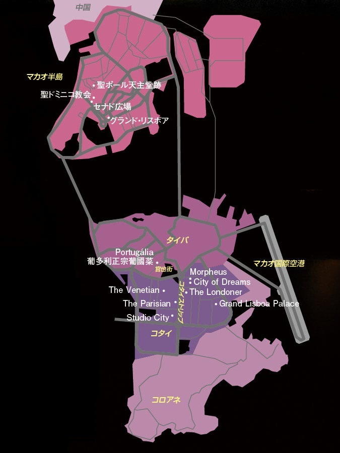 エリアを大きく分けると、マカオを代表するカジノホテル「グランド・リスボア」があるマカオ半島と、埋立地に巨大なカジノホテルが立ち並ぶタイパコタイ地区に分かれます。空港はタイパ側にあり、統合型リゾート(IR)への滞在であれば、空港から無料シャトルバスを10~20分感覚で運行しているため、到着してからの移動がスムーズです。