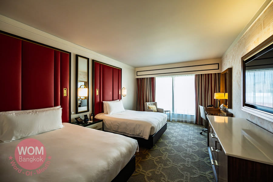 パリのエッフェル塔の1/2サイズレプリカが象徴的なパリジャン。客室は全2500室以上あり、デラックスルーム(33m2)からスイート(72m2)までいずれの部屋も高級感あるデザインとなっています。コタイストリップを挟んだ向かい側にフランス式庭園があり、そこからエッフェル塔を見るとまるでパリにいる気分! エッフェル塔は中に入ることもできます。ホテルにはショッピングアーケード、レストラン、フードコートなどが揃っており、隣のベネチアン、向かいのロンドンナーには通路で繋がっています。