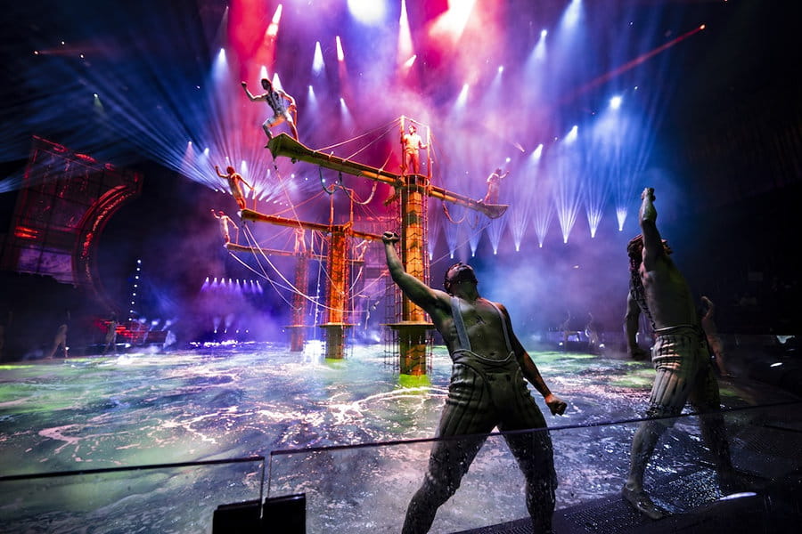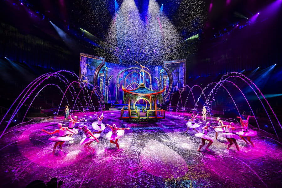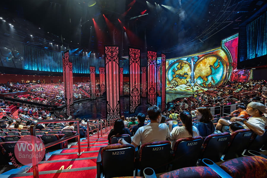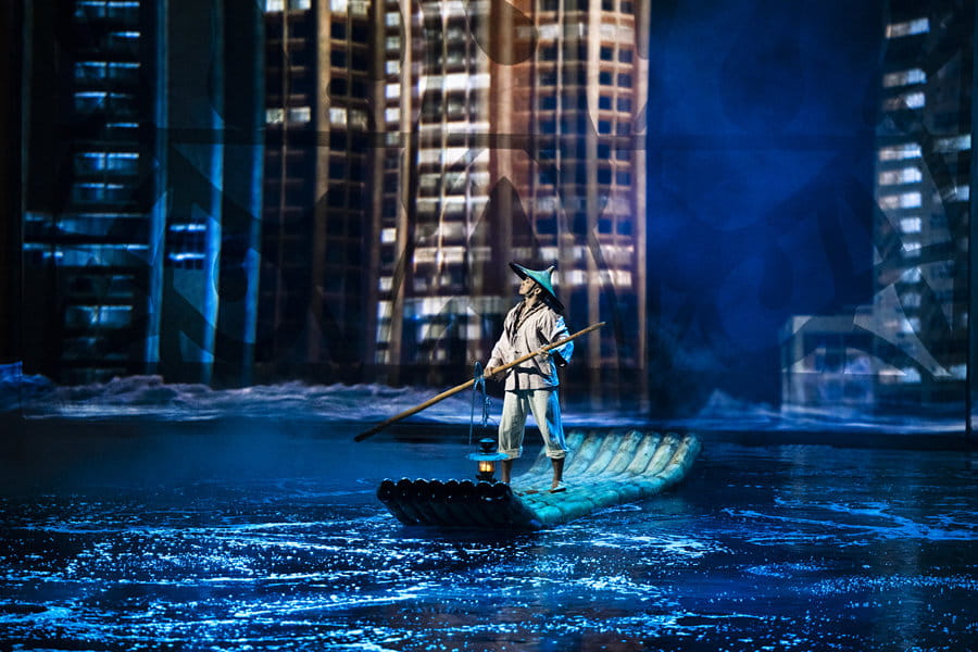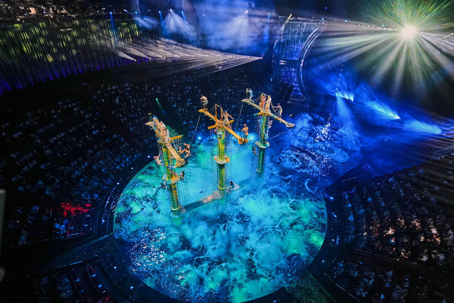 水・光・音・アクロバットの融合、アジアの「シルク・ドゥ・ソレイユ」とも例えられるアジア最大級のエンターテイメントショー。2025年に脚本をリニューアルし、再開を果たしました。見どころは何と言ってもステージが水と陸に変化すること。プールとなれば、高さ25mからのハイダイブが可能なほどの深さとなり、元オリンピック選手を含むキャストが次々と飛び込んでいきます。約90分の公演ですが、舞台がどんどん変化するので全く飽きることがありません。セリフはほとんどなく、外国人が観ても十分、内容は伝わります。また、空中ショーの一部にバイクのアクロバットショーがありますが、こちらも大迫力! ぜひご覧ください。